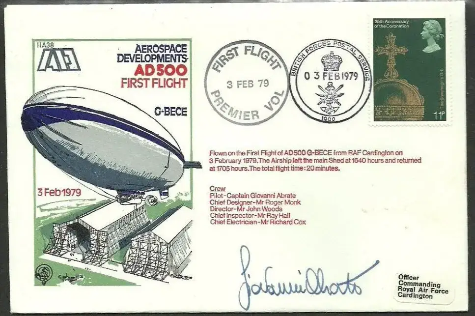 On 3rd February, it was originally noted that the flight had been cancelled for weather reasons; however, two additional independent checks of the weather and wind conditions showed that the wind strength was quite low. Roger Munk gave instructions that the original flight programme should go ahead, although delayed for several hours, and for the ship to be moved on to its mobile mast and out to the mouth of the hangar. The limit for the day’s flight was that it needed to be taken by sunset, which in the winter was at 16:51pm. The team were able to get the ship out of the hangar without a problem. The Aerospace Developments Chief Inspectors, Ray Hall, pronounced himself satisfied with the ship and ready for its first flight. So with the pilot, Giovanni Abratti, John Wood, Ray Hall, Dick Cox, the Aerospace Developments electrical engineer, and Roger Munk himself, boarded the ship. The Porsche engines fired up perfectly, and within 10 minutes, permission to take off was granted. The AD 500 left the ground and climbed away at a 45-degree angle with a very fast climb, and about five degrees nose-up trim. At 500ft, they levelled off and cruised over Shortstown. AD 500 was cruising at about 50 mph, close to the maximum cruise speed. The ship soon turned and returned to the Cardington airfield, and lined up in the wind to come up to their landing point. Vectoring the engines allowed the ship to come down for a perfect landing.