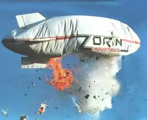 With all the James Bond movies in the franchise, the ending had to be dramatic and thus normally show a large explosion. A View to a Kill was to be no exception. The ending had to be dramatic, but also be careful not to totally discredit the fledgling industry, which was always trying to move away from this historical stigma. Within the terms of the leasing contract with the EON, the 007 production company, Airship Industries had stipulated that the airship could not be shown as exploding in the similar expectations as airship disasters in the past, notably the LZ-129 Hindenburg. It was known that this would be the image and sales potential.
