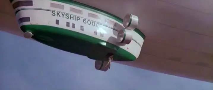 A mock-up model had been made showing a larger Skyship 5000 with a double-decked gondola and four ducted propulsion units. This was shown floating over San Francisco Bay, and cleverly disposing of a conference passenger. The ship was similar to the designs at the time of a larger skyship 5000, and the envelope and shape of the gondola can be seen as almost direct copies of the designs. The ship was mocked up in green Zorin Industries livery. As the ship flies into San Fransico for the final half of the film, our Villain’s assistant, May Day, portrayed by Grace Jones, looks out of the front of the ship’s gondola, exclaims “What a View..” and Christopher Walken finishes the line “… to a Kill”.