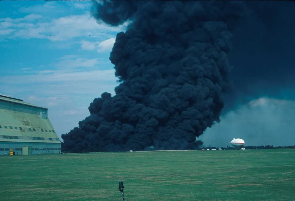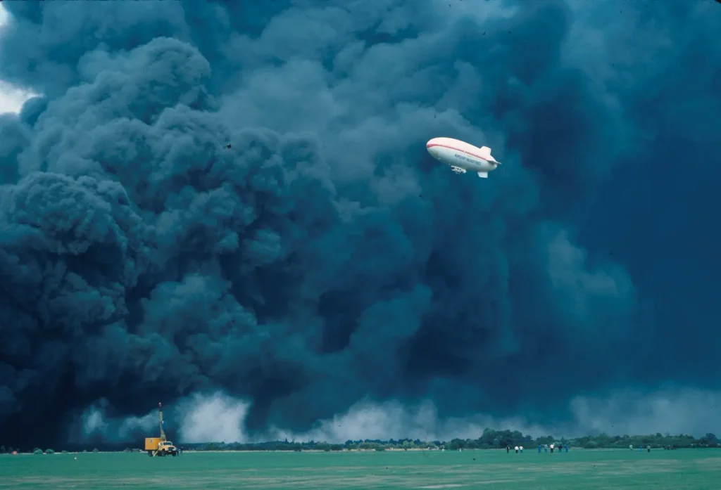 I was on the balloon bed at the time with two of the crew and suddenly saw this immense cloud of black smoke rising and luckily not blowing our way. Then we saw the airship pilots and crew running over to their airship 500 which was on a nearby mast mooring. Very soon they took off and cruised around fairly close to the plume until the fire came under control. I phoned our administrator and asked her to drive quickly iover with the unit camera (no smartphones in those days) which she did and hence those photos.