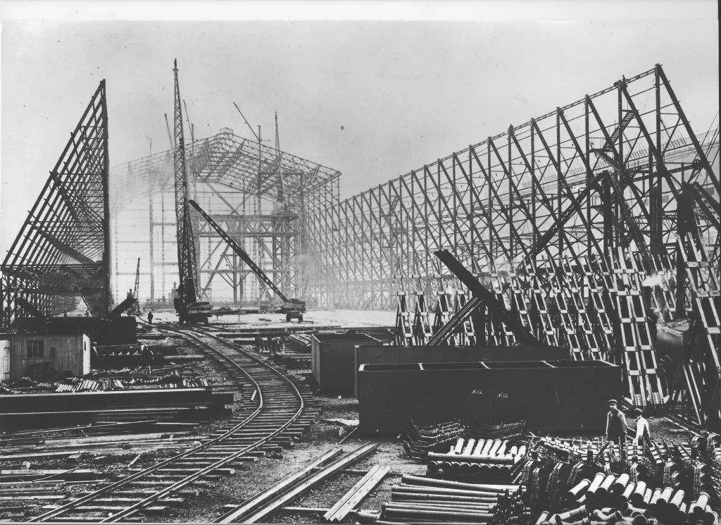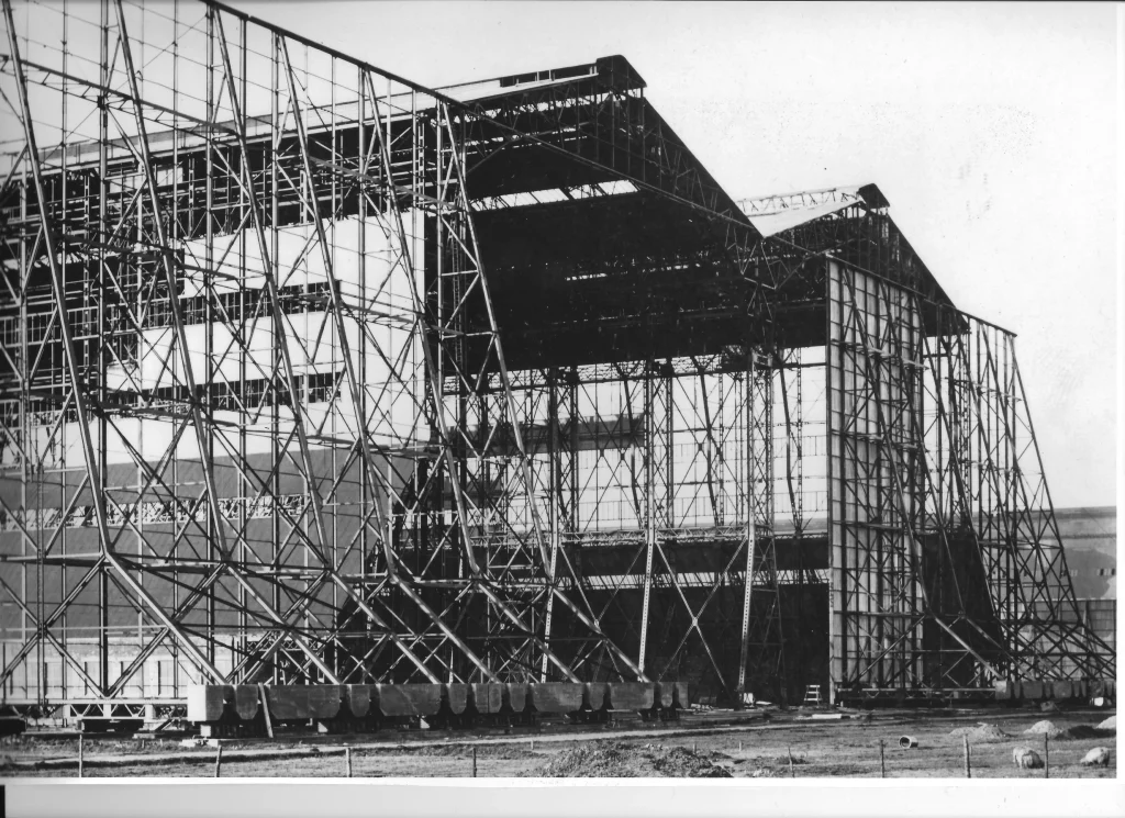 The massive shed still stood surrounded by debris of the wartime airship sheds. The owners had abandoned the shed in the face of falling scrap metal prices. The shed’s door clearance of 130ft had to be increased by 10ft to accommodate the R 100.
